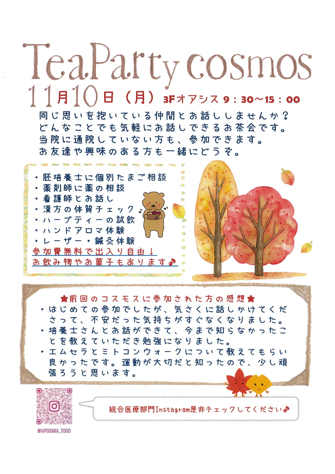 コスモスは、同じ思いを抱いている仲間が出逢え、医師、看護師、薬剤師、胚培養士、カウンセラー達とアットホームにお話ができる場所です。ここに来てお話していただければ少し心のモヤモヤが晴れるかもしれません。
