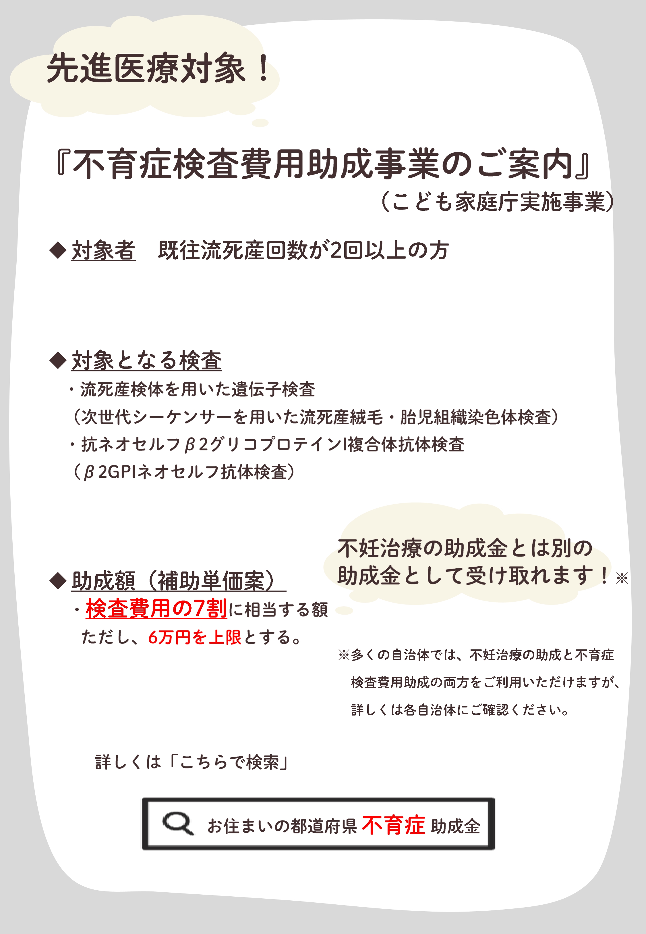 また、国が主導する不育症検査費用助成事業をはじめ、独自の助成事業を行っている自治体も増えてきています。
