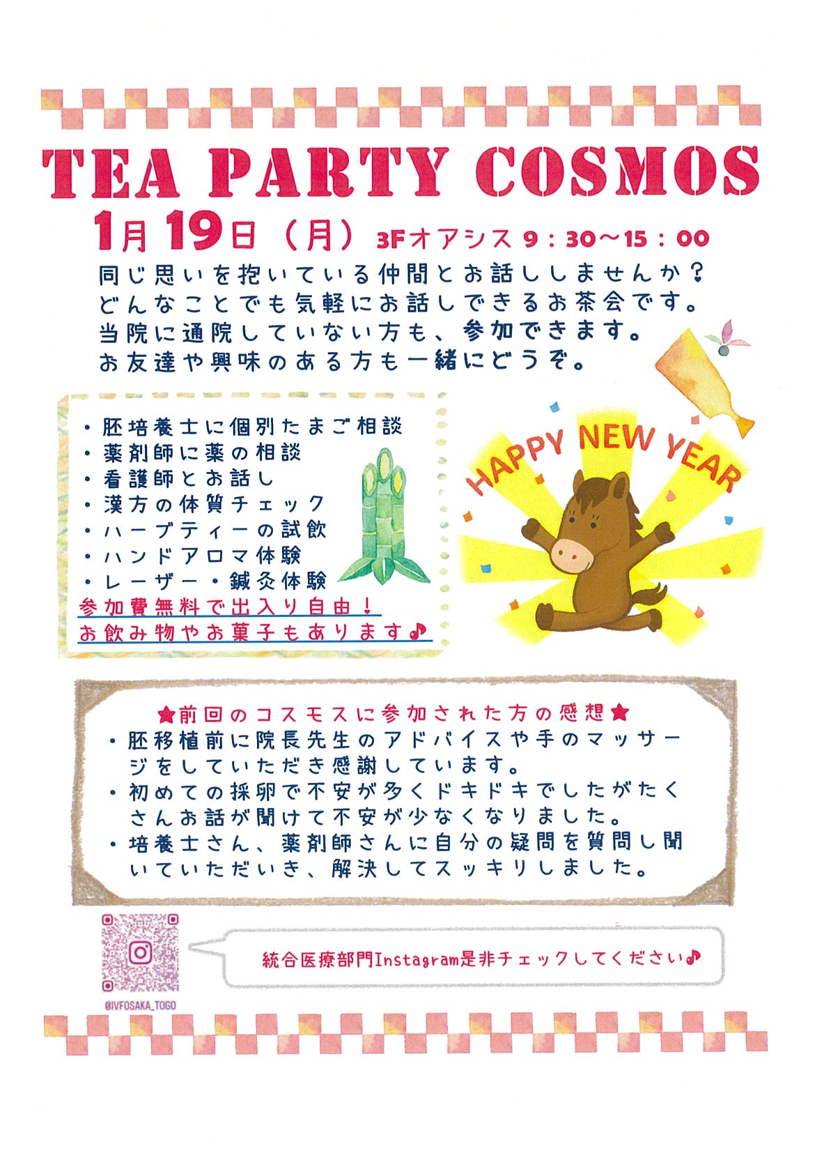 コスモスは、同じ思いを抱いている仲間が出逢え、医師、看護師、薬剤師、胚培養士、カウンセラー達とアットホームにお話ができる場所です。ここに来てお話していただければ少し心のモヤモヤが晴れるかもしれません。