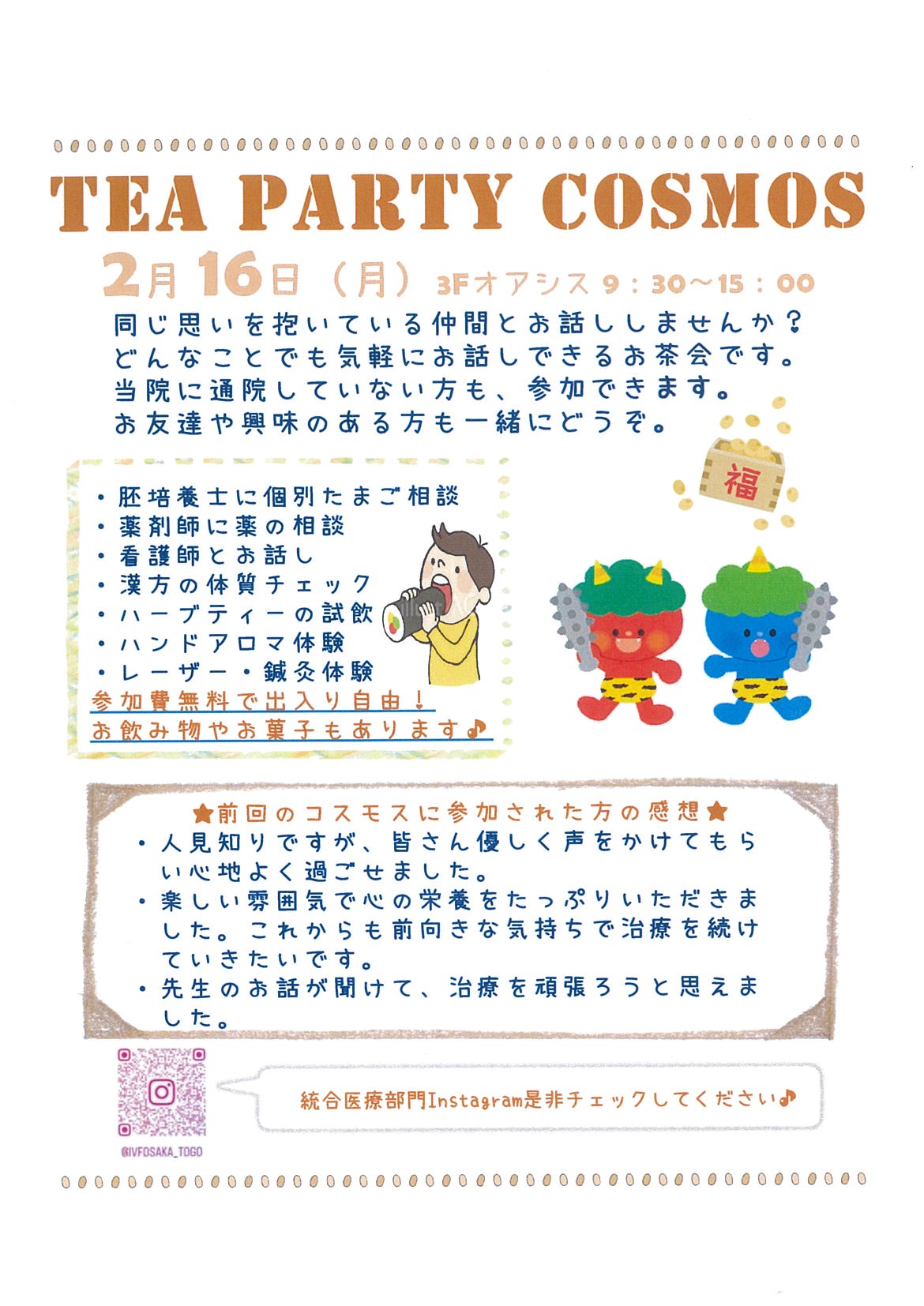 コスモスは、同じ思いを抱いている仲間が出逢え、医師、看護師、薬剤師、胚培養士、カウンセラー達とアットホームにお話ができる場所です。ここに来てお話していただければ少し心のモヤモヤが晴れるかもしれません。