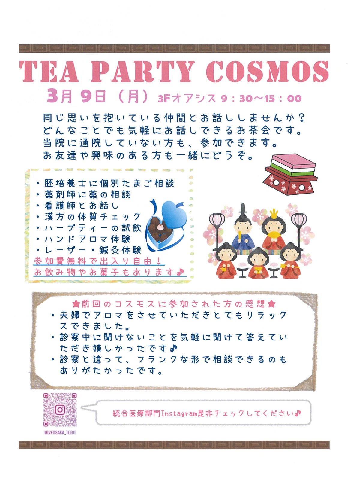 コスモスは、同じ思いを抱いている仲間が出逢え、医師、看護師、薬剤師、胚培養士、カウンセラー達とアットホームにお話ができる場所です。ここに来てお話していただければ少し心のモヤモヤが晴れるかもしれません。