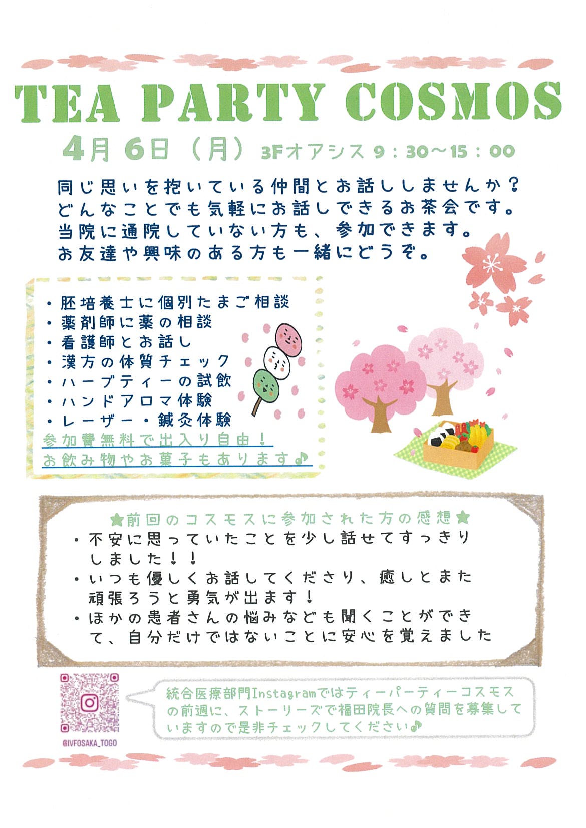 コスモスは、同じ思いを抱いている仲間が出逢え、医師、看護師、薬剤師、胚培養士、カウンセラー達とアットホームにお話ができる場所です。ここに来てお話していただければ少し心のモヤモヤが晴れるかもしれません。